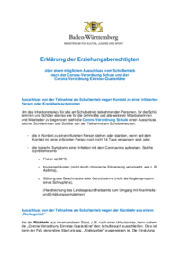 Erklärung der Erziehungsberechtigten über einen möglichen Ausschluss vom Schulbetrieb nach der Corona-Verordnung Schule und der Corona-Verordnung Einreise-Quarantäne Ausschluss von der Teilnahme am…