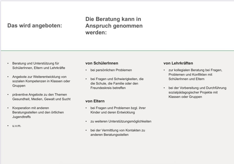 - Beratung bei Fragen und Schwierigkeiten, die die Schule, die Familie oder den Freundeskreis betreffen